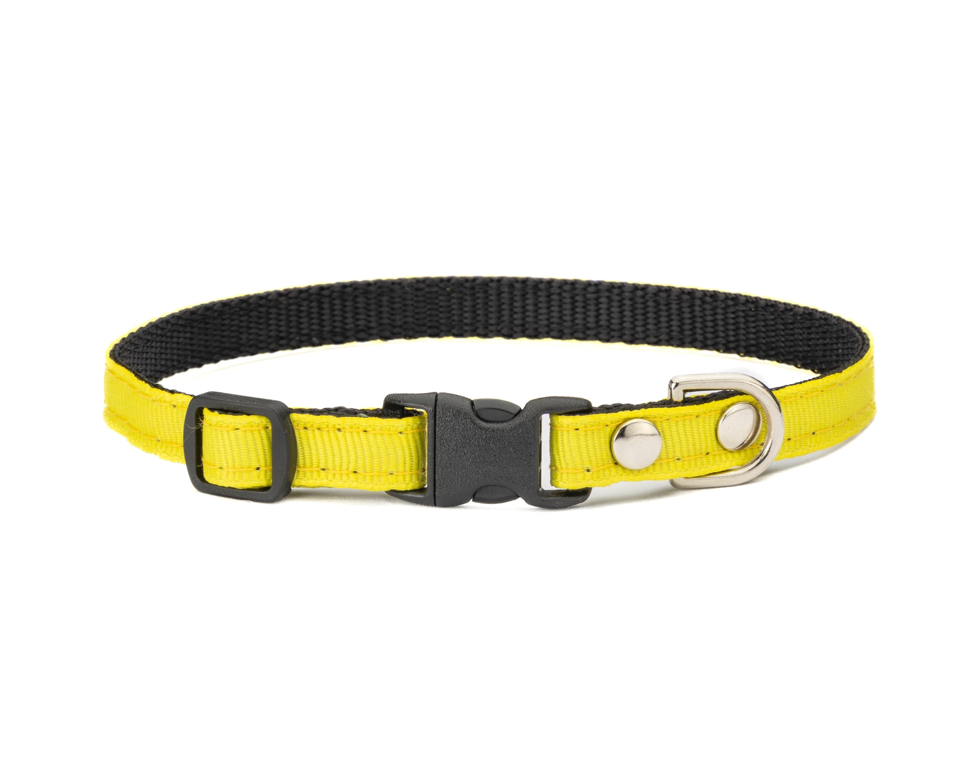 Our tiny nylon collars are 3/8" wide and adjust from 6.5-10". They are made from nylon and ribbon, tiny plastic quick-release clips and solid metal rings.
